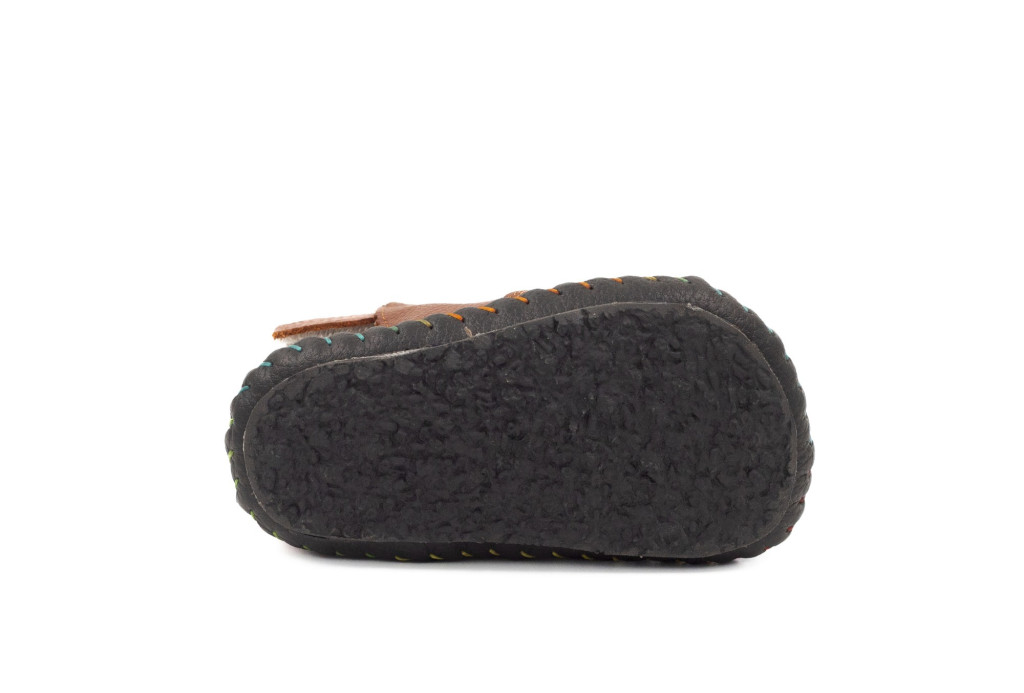A Little Bear csizmácska kézzel vágott, puha bőr talppal készül, amelyet egy vékony, csúszásgátló gumialap erősít – így az első lépéseknél is megmarad a jó talajérzet és a biztos tapadás. A széles orr-rész támogatja a természetes lábujjszétnyílást, a két oldalsó, állítható pánt pedig stabil, mégis kényelmes rögzítést ad a bokánál.